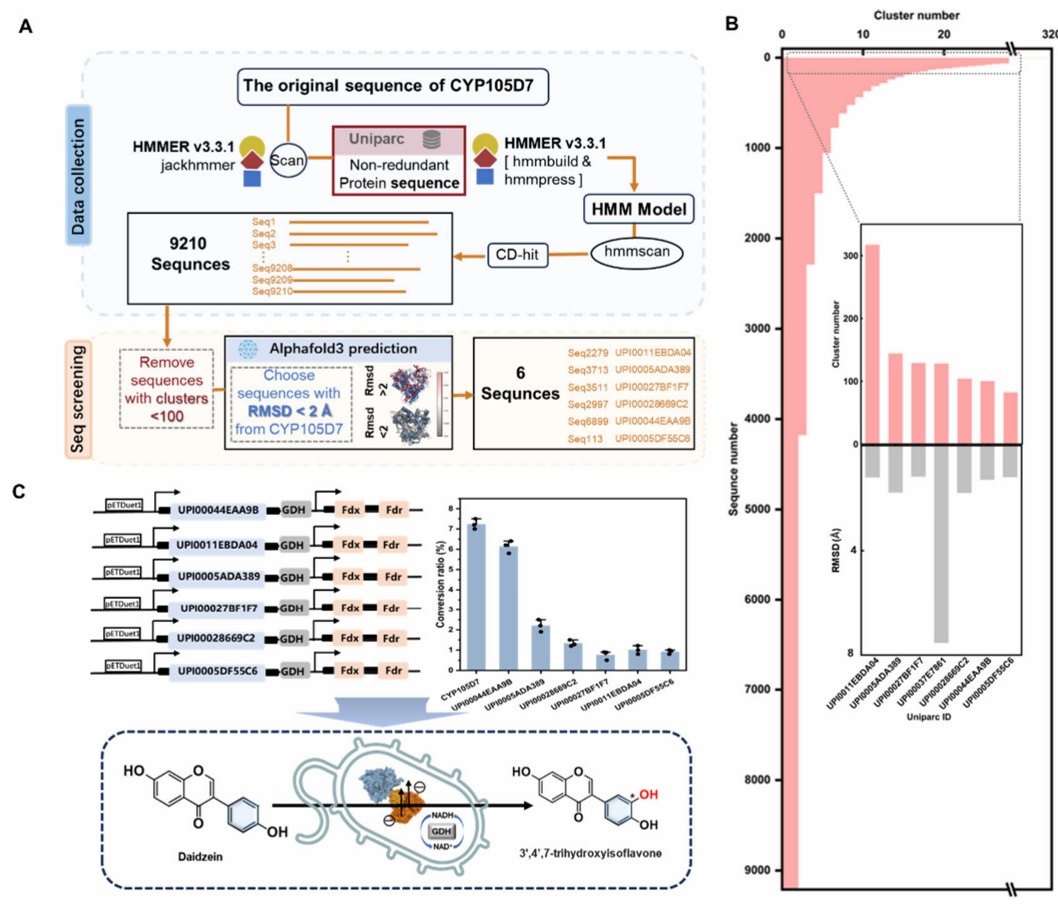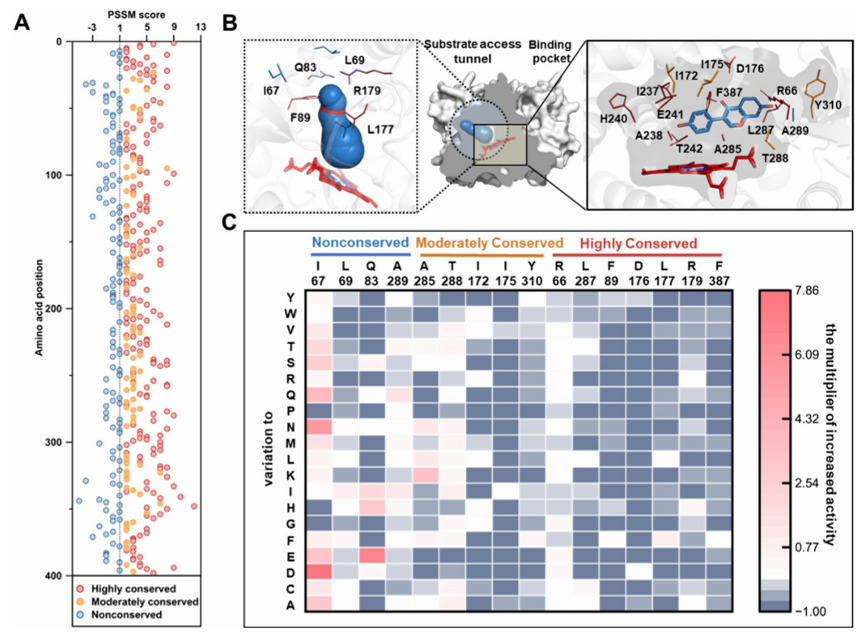 本研究以细胞色素P450单加氧酶CYP107Hb.am为模型。通过ESTEEM策略,研究团队筛选出位于底物隧道瓶颈区的两个非保守残基Ile67和Gln83, 经两轮迭代饱和突变,获得双突变体CYP107Hb.amI67DQ83H。 该变体展现出令人瞩目的催化性能提升:总周转数(TTN)提升106倍,催化效率提升82倍,耦合效率从0.6%大幅提升至69.85%,热稳定性同步提高。