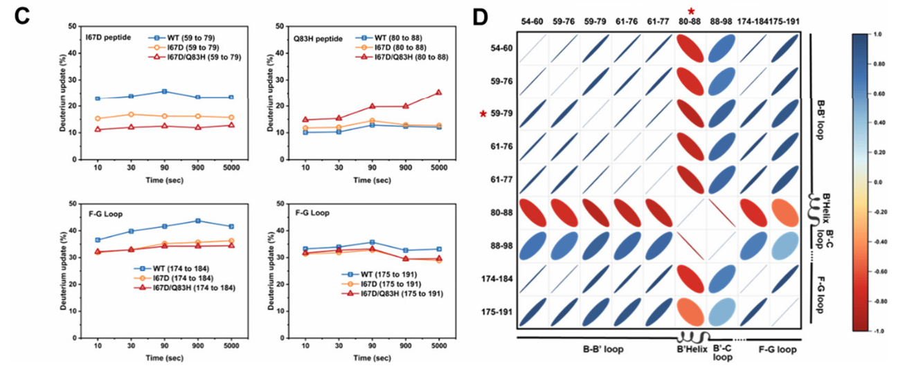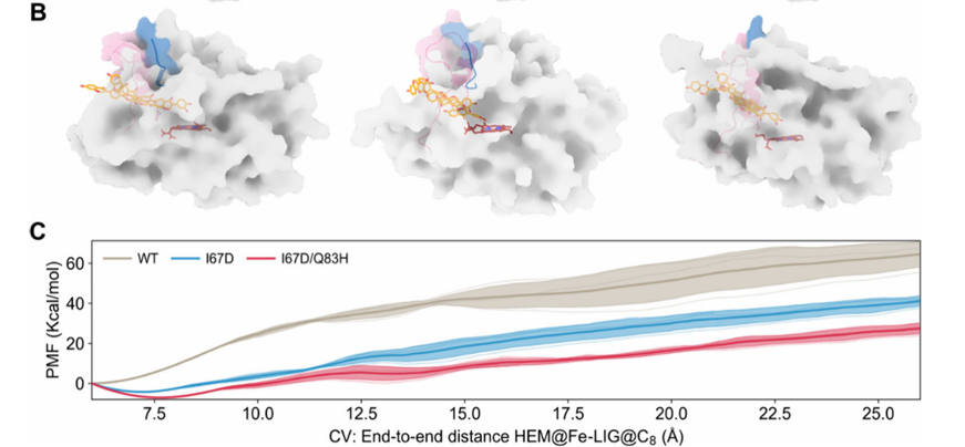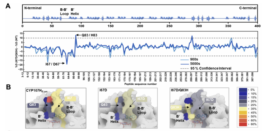 性能的提升需要机制的阐明。研究团队采用了一系列手段,其中氢氘交换质谱(HDX-MS)在揭示变体动态构象变化方面发挥了不可替代的作用。 1. 技术原理 HDX-MS通过测量蛋白质主链酰胺氢与氘代溶剂中氘的交换速率,来定量分析蛋白质不同区域的构象动态性与溶剂可及性。氘摄取率的降低表明该区域结构刚性增强或溶剂可及性降低;反之,则表明柔性增加。 2. 核心发现 通过对野生型及双突变体进行HDX-MS分析(图3),研究获得了以下关键发现: I67D突变诱导刚性化:位于B-B’环的I67D突变导致该区域肽段的氘摄取率显著降低(从~24%降至12%),表明该突变稳定了隧道瓶颈区的局部构象,减少了无效波动(图3A, 3C)。 Q83H突变引入局部柔性:与之相对,B’螺旋上的Q83H突变则使其所在肽段的氘摄取率升高(从~12%增至19%),提示该区域动态性增强(图3A, 3C)。 协同效应与远程调控:双突变体呈现出一种“刚柔并济”的协同动态模式:B-B’环与F-G loop的刚性增强,而B’ helix的适度柔性化,共同优化了隧道的整体构象。相关性分析进一步显示,这些关键区域的运动模式从互不相关转变为高度协同 (图3D)。 图3. HDX-MS技术阐明CYP107Hb.am突变体关键区域的结构刚柔变化 结合自适应导向分子动力学(ASMD)模拟与HDX-MS实验数据,研究提出了一个令人信服的机制模型:ESTEEM策略所筛选的隧道残基突变,并非简单地扩大隧道尺寸,而是通过重新平衡隧道关键区域的刚性-柔性关系,塑造了一个几何结构更优、动态更稳定的底物传输路径。这种“动态变构”效应降低了产物解离过程中的自由能垒 (图4C,PMF降低近20 kcal/mol),从而极大地提升了催化周转速率。ASMD模拟直观地展示了产物沿此优化路径的排出过程 (图4B)。 图4. CYP107Hb.am突变体的平均力势能PMF降低 这项工作标志着酶工程正从对静态结构的依赖,迈向对动态构象进行理性设计的新阶段。同时,HDX-MS技术有望在该领域发挥更多、更广泛的应用,解密酶改造后的结构动态变化,为酶工程设计提供基于蛋白结构方面的实验论据。 百蓁生物提供全套的 HDX-MS 服务体系,以发现各种类型样品,例如单克隆抗体(mAb)、抗体-药物偶联物(ADC)、病毒衣壳、生物仿制药等蛋白质构象、动力学、相互作用的信息,可用于生物仿制药评价、治疗性蛋白质QC、药理学研究等应用领域。 服务优势: 经验丰富:5年+专业团队经验,100+成功项目,助力发表10+高分文章。 预实验保障:独家免费定制化预实验,确保正式实验高效推进。 深度数据解析:自主PEAKS®软件平台精准分析,提升肽段覆盖率和数据准确性。 全流程优化:一站式服务+人工谱图校正,保证结果高重现性、高准确性和高稳定性。 可视化呈现:丰富图表结合pyMOL/Chimera蛋白结构渲染,提升结果直观性与可读性。 图5. HDX-MS结果展示形式HDX-MS:从性能提升到机制解析的关键桥梁